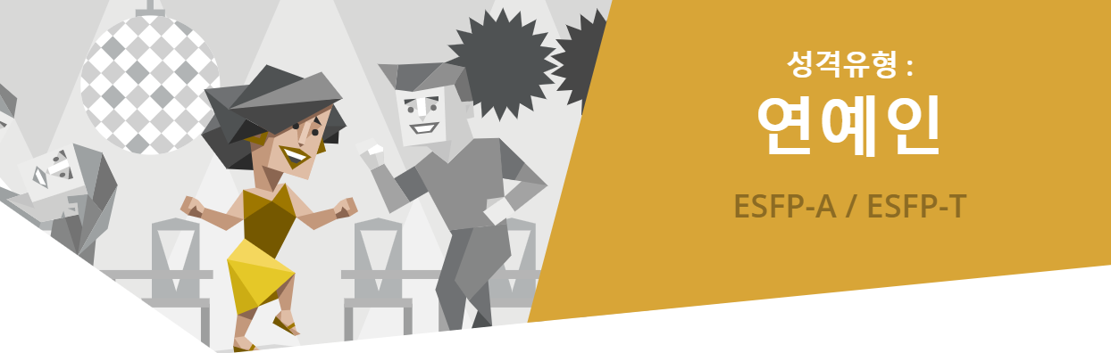 - ESFP 연예인 - 사람들을 즐겁게 하며 에너지와 열정이 넘치는 연예인으로 타고난 센스와 낙천적이 성격으로 주변 사람들과 원만한 관계를 유지하는 연예인