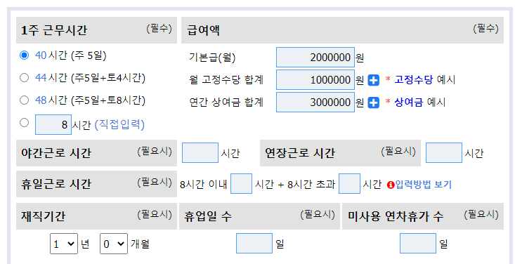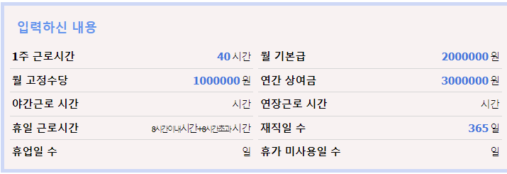 예시 : 주 5일, 8시간 근무, 월 기본급 200만 원, 월 고정수당 100만 원, 연간 상여금 300만 원