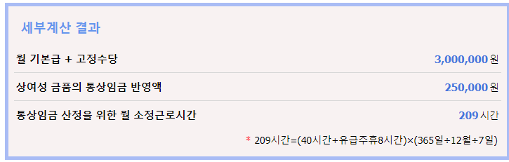 통상임금 계산기를 이용해서 계산해 보면 위와 같이 월 근로시간 209시간 계산 적용하여 주 근로시간 40시간 , 주휴시간 8시간, 월기본급에 고정수당에 월간 상여금을 더 하여 월 급여는 3,250,000원이며 시간당 통상임금은 15,550원이 됩니다.