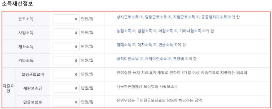 고정재산인 부동산, 금융자산, 자동차, 월급, 일당 등의 소득과 재산 등이 정해진 공식에 따라 환산하여 적용됩니다.