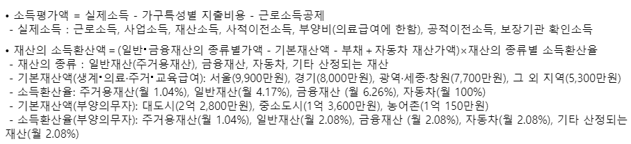 위의 기준 중위소득의 경우 소득과 재산을 더한 값으로 계산이 됩니다. 버는 돈 모두를 소득으로 보지 않고, 재산 역시 일정한 규칙에 의해서 소득인정액으로 변환하게 됩니다.
