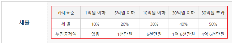 증여세 과세표준은 최저 10% , 최고 50% 세율이 적용됩니다.