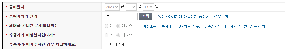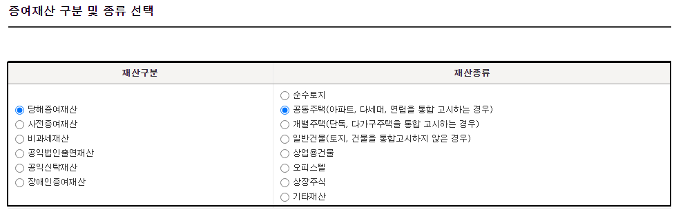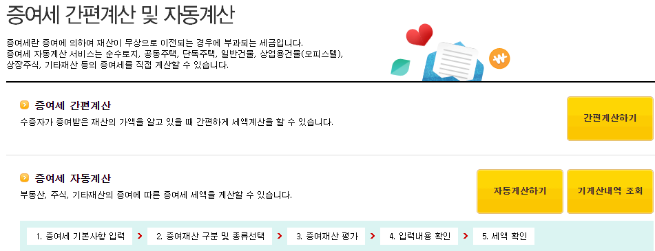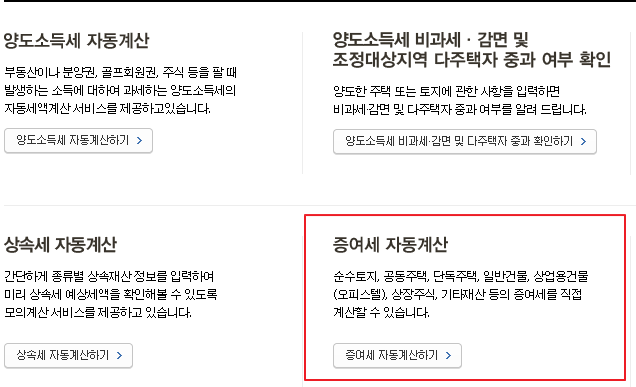 부동산, 주식, 기타 재산의 증여에 따른 증여세 세액을 계산하고 싶다면 증여세 자동계산을 선택하시기 바랍니다.