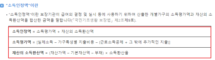 기준 중위소득 소득인정액의 계산은 복잡한 계산식으로 되어 있기 때문에 복지로 홈페이지에서는 쉽게 생계급여 신청자격 여부를 확인할 수 있도록 소득인정액 모의계산기를 제공하고 있습니다.