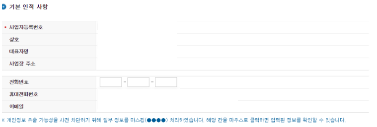 먼저 기본적인 인적사항을 적는 곳이 있습니다. 위의 사업자등록번호를 누르면 본인의 사업자등록번호가 자동으로 입력됩니다.