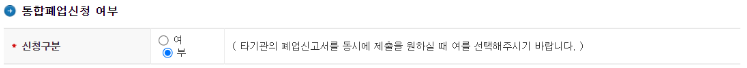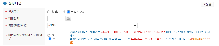 그럼 밑에 신청업무란의 휴폐업신고를 선택합니다. 여기서 휴업 폐업 전부 신고할 수 있습니다.