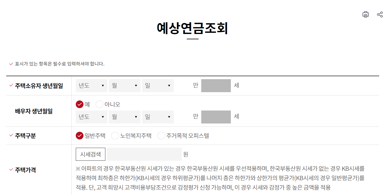 위의 바로가기를 통해 주택연금 예상연금조회 홈페이지로 이동했다면 주택소유자 생년월일을 입력하고 주택구분을 선택합니다.