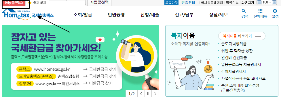 종합소득세 환급금 조회 방법으로는 홈택스 홈페이지에서 자주 찾는 메뉴에서 'my 홈택스'를 선택합니다. 'my 홈택스' 메뉴에서 환급목록 조회를 하면 종합소득세 환급금 조회할 수 있습니다.