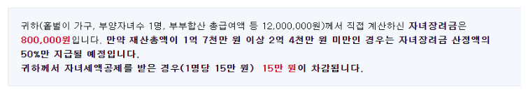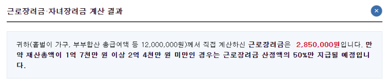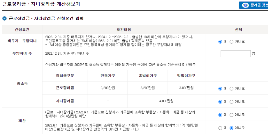 정부 홈택스에서 제공하고 있는 근로장려금 계산기이기 때문에 보다 정확하게 근로장려금 금액을 계산해 볼 수 있으며 쉽게 근로장려금 지급 대상자 여부를 확인할 수 있습니다.