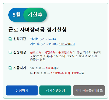 근로장려금 지급일은 정기 신청, 반기 신청에 따라 차이가 있습니다. 근로장려금 반기 신청은 상반기, 하반기로 나뉘며 근로소득자만 신청할 수 있습니다.
