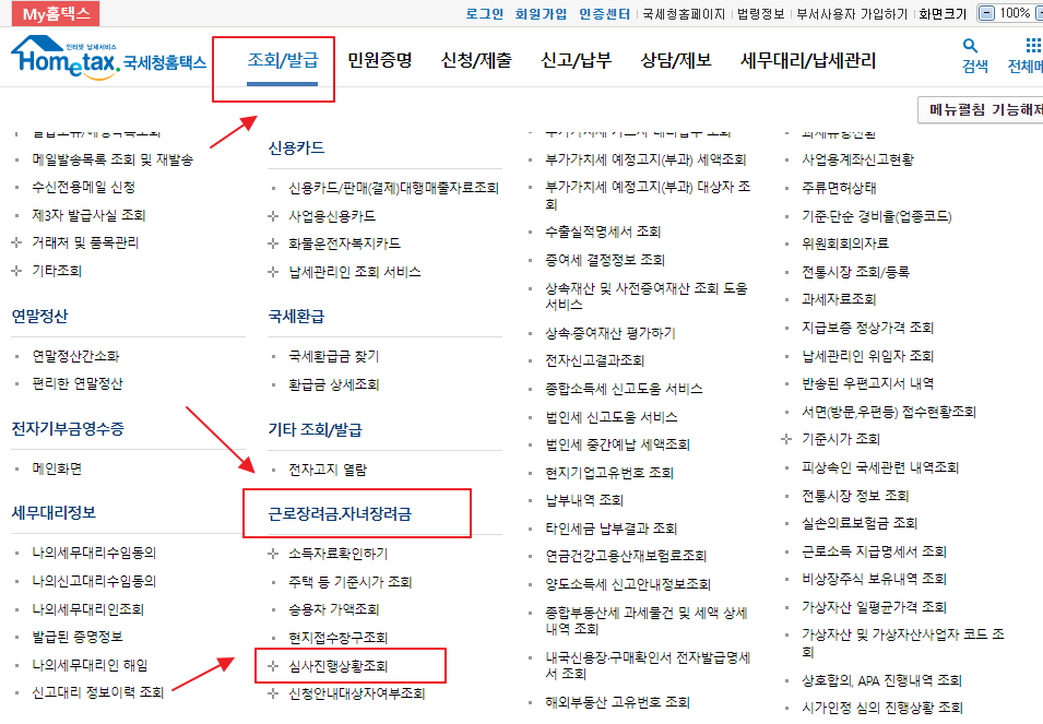홈택스 홈페이지에서 로그인 후 상단에 보시면 조회. 발급 메뉴가 있습니다. 클릭하고 하단에 보면 '근로장려금, 자녀장려금' 메뉴를 확인할 수 있습니다. 클릭하면 '심사진행상황조회' 메뉴를 선택하면 근로장려금 심사 결과를 조회할 수 있으며 이전에 내가 받았던 근로장려금 내역도 확인할 수 있습니다.