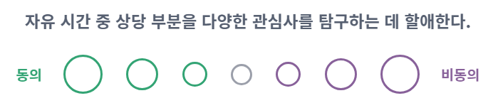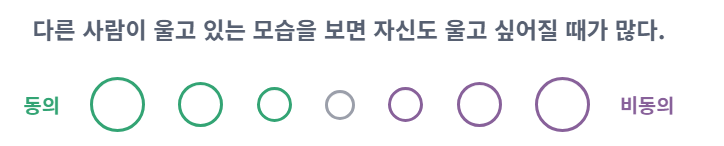 질문이 많다고 느껴질 수 있지만, 각 질문에 떠오르는 답변을 빠르게 선택하는것이 중요합니다. 과도한 고민보다는 직감적인 답변을 선택하는 것이 정확한 결과를 얻을 수 있습니다.